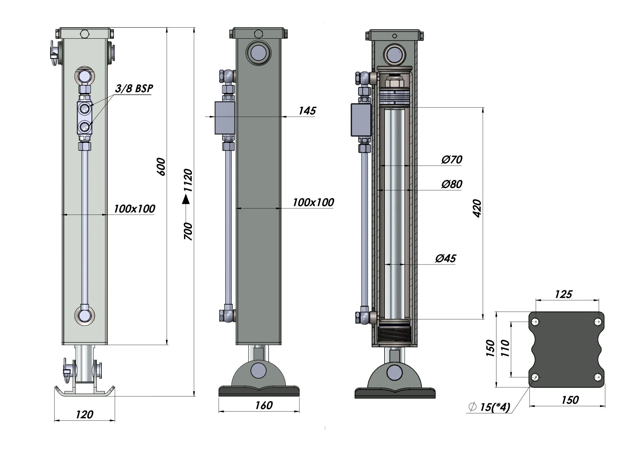 DIVPUSĒJAS DARBĪBAS HIDRAULISKĀ ATBALSTA KĀJA (100x100x700 mm) - GAJIENS 420 mm - 5.000 kg